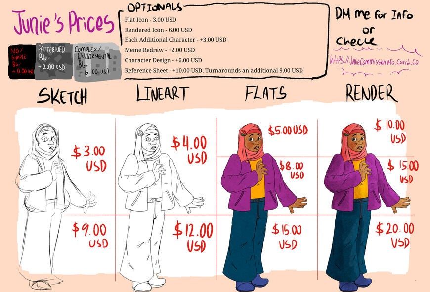 Hello! Welcome to the Junie Commission Info Card, where I keep my portfolio link, commission rules and pricing, as well as socials!While I do take traditional commissions, I am also doing fundraising efforts for places like Palestine, Sudan, and Yemen, so please check that particular carrd out too.You can contact me on Discord as junebugs3060, or [email protected].